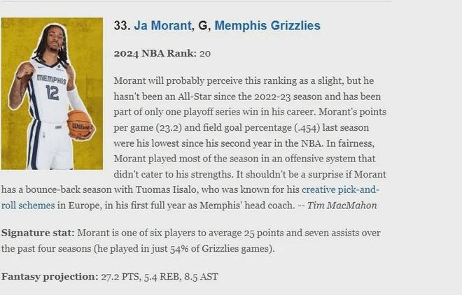在新赛季开始前ESPN发布的NBA百大球星中,莫兰特排名第33位,上赛季初他排名第20位,可以看出他的声望在持续下降,网站评语如下: